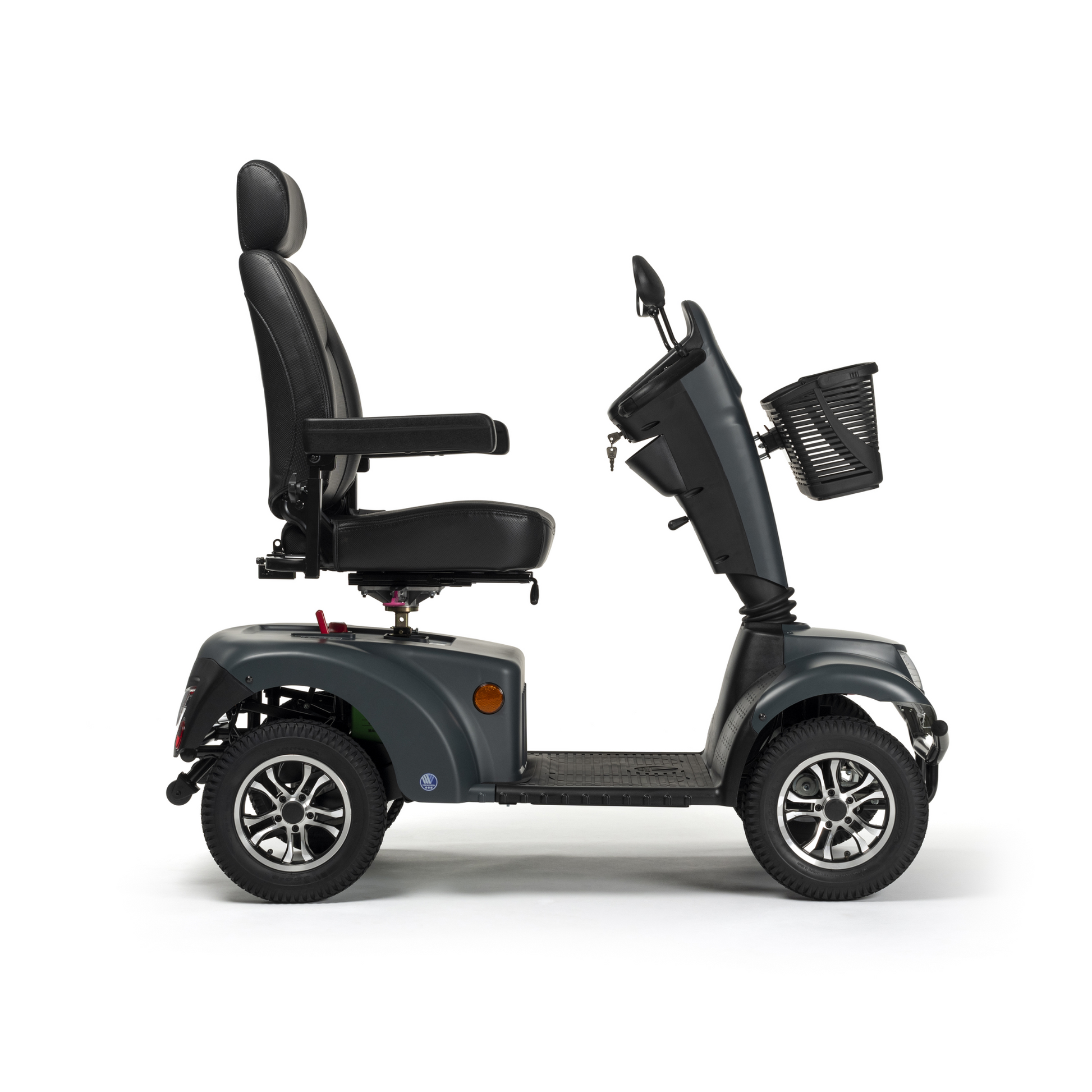 Lo scooter CARPO 2 XD SE combina comfort e robustezza, perfetto per affrontare percorsi con salite. Lo schienale regolabile e girevole, insieme all’appoggiatesta adattabile, garantiscono una postura ottimale. I braccioli regolabili in altezza e profondità aumentano la personalizzazione. Dotato di luci e frecce anteriori e posteriori per una guida sicura, monta pneumatici gonfiabili con cerchi neri per una migliore aderenza. Con motore da 750 W, due batterie da 80 Ah e velocità massima di 13 km/h.
