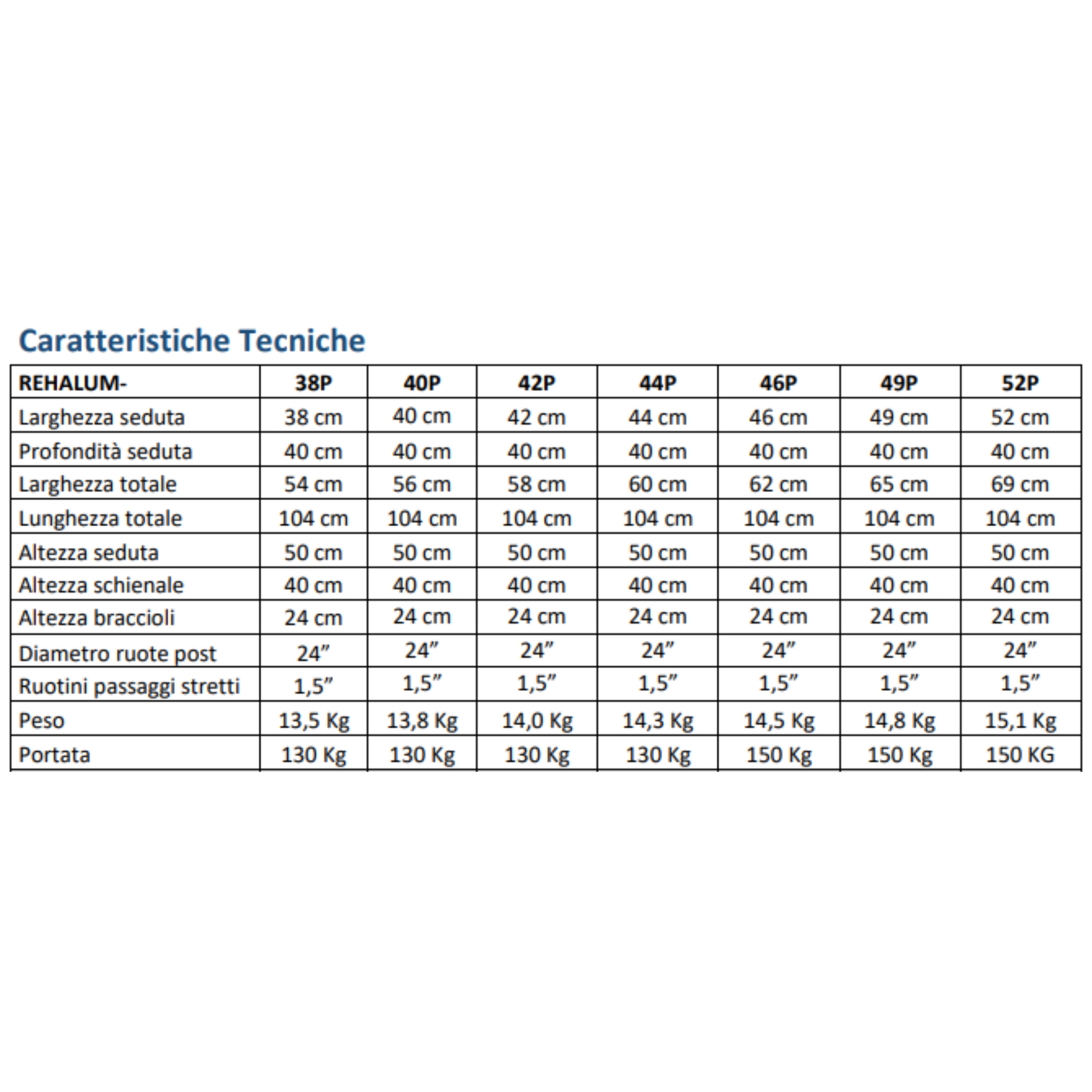REHALUM: carrozzina con telaio in alluminio, pieghevole e offre una configurazione standard con ruote posteriori ad estrazione rapida da 24” con copertone in PU, forcelle in alluminio per le ruote anteriori, braccioli ribaltabili, pedane regolabili e seduta in Nylon imbottito, tasca posteriore per oggetti e cintura di sicurezza garantiscono comfort e sicurezza.
